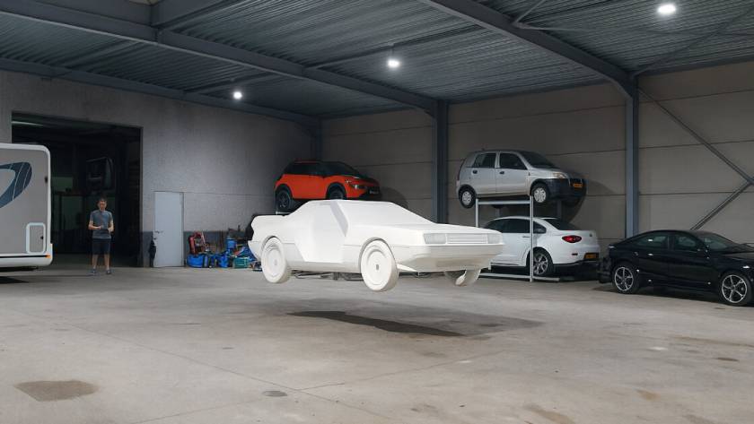 خودروی دلورین ساختهشده از فوم، از فیلم «بازگشت به آینده»، با استفاده از فناوری پهپاد در هوا شناور میماند.